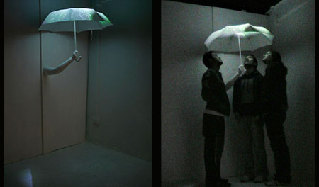Materials: aluminum arm cast, umbrella, digital video and sound, motion sensors